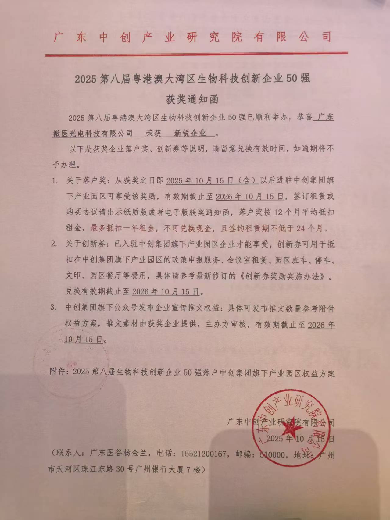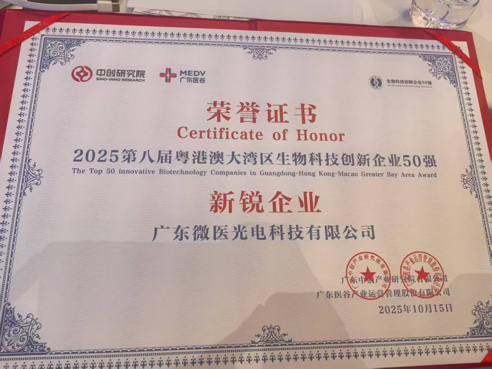 祝贺广东微医光电科技有限公司获得2025第八届粤港澳大湾区生物科技创新企业50强“新锐企业”奖。
